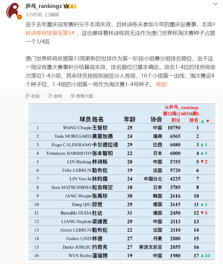 国乒教练组在确认让林诗栋退出重庆冠军赛时应该就知道林诗栋的世界排名会跌至第五,这对澳门世界杯的种子位有巨大的影响。